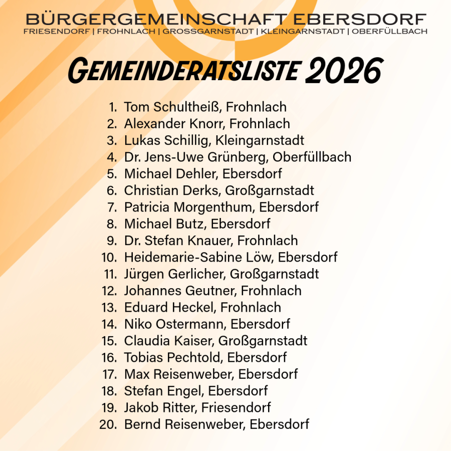 Schenkt uns am 08.03.2026 Euer Vertrauen und wählt Tom Schultheiß als Bürgermeister sowie die BG mit allen 20 Stimmen!